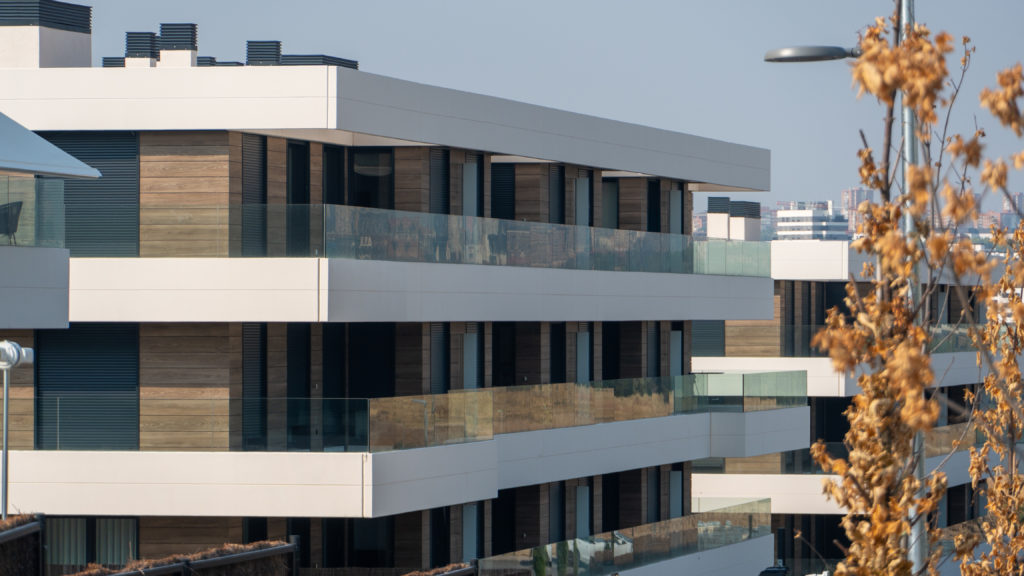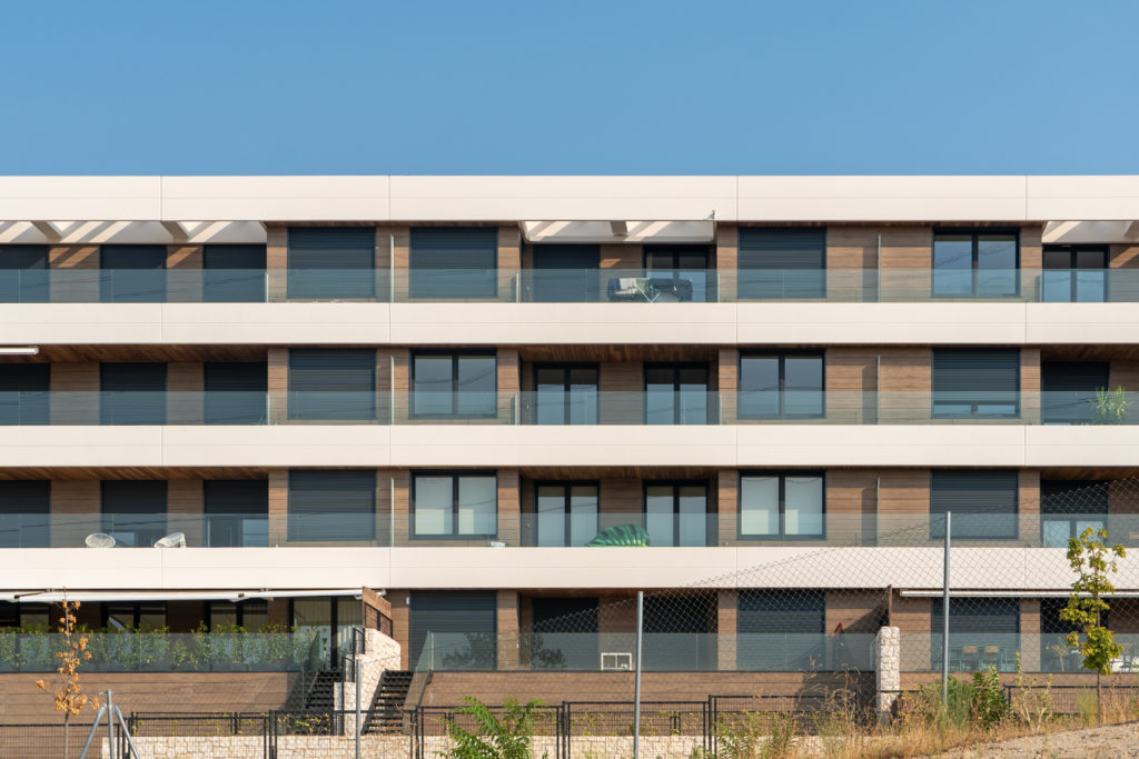 La versatilidad de nuestros sistemas de fachada permitió materializar este concepto mediante un acabado blanco continuo, que potencia la luminosidad y aporta coherencia al conjunto. Los paneles PHA resuelven los cerramientos principales y los petos de las terrazas, conformando una piel uniforme que garantiza eficiencia energética, durabilidad y una estética atemporal.