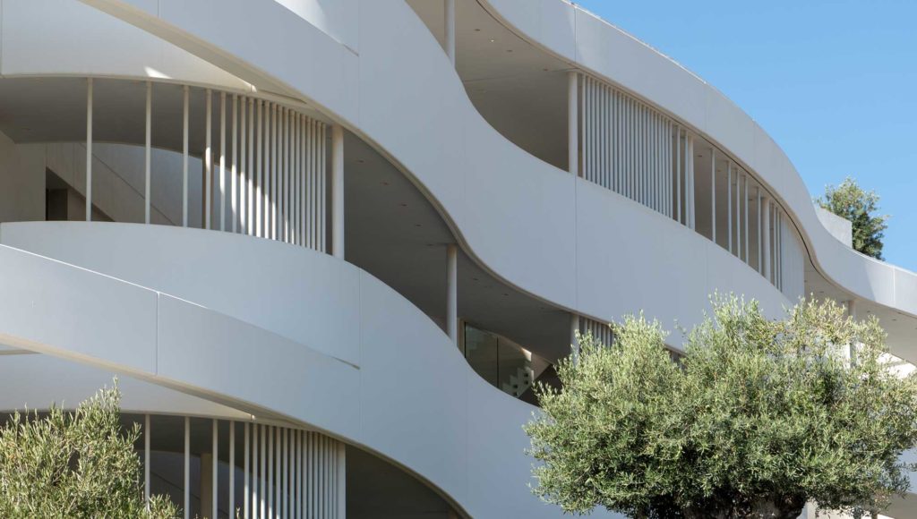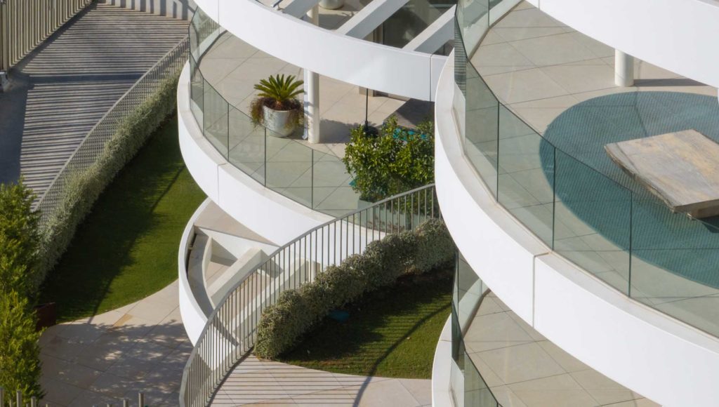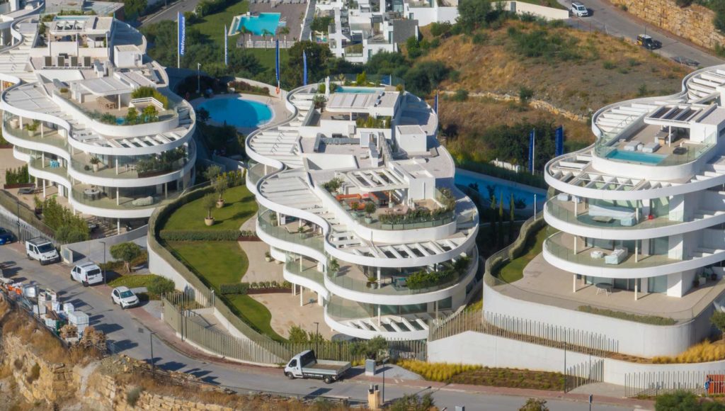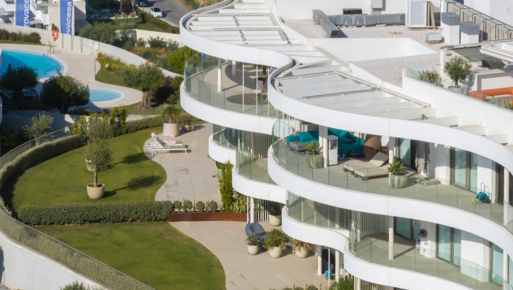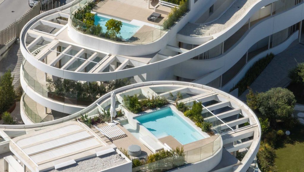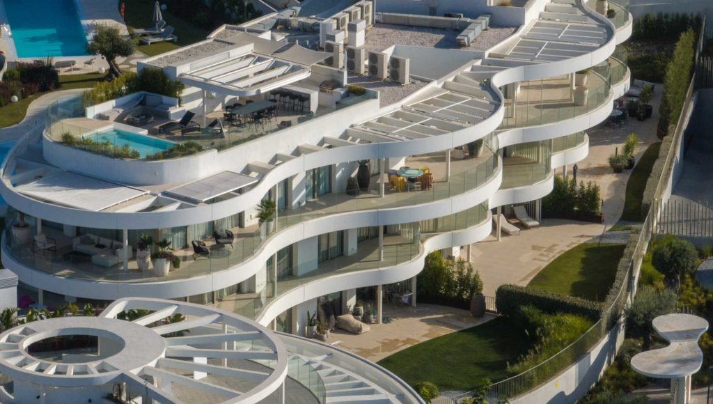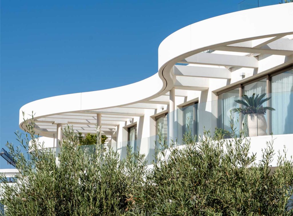 Este exclusivo conjunto residencial se alza en lo alto de Benahavís, con vistas abiertas al Mediterráneo y una implantación que abraza la topografía natural. Para dar forma a su arquitectura fluida, se emplearon paneles industrializados tipo sándwich en petos de terrazas y pérgolas, capaces de adaptarse a volúmenes curvos sin necesidad de juntas visibles.